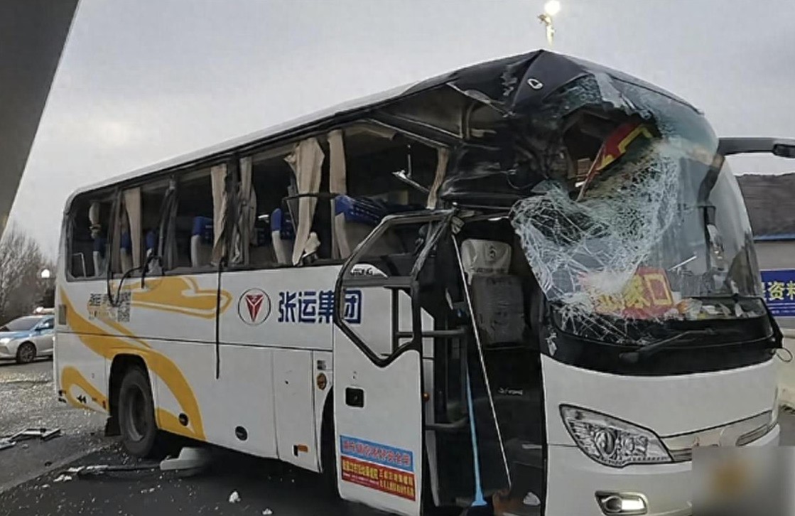 从网友拍摄的视频来看,大巴车车身印有“张运集团”标识,车头几乎被撞扁,右侧车窗玻璃全部破碎,车门严重变形,整辆车看起来伤痕累累。另一侧,一辆运输风电桨叶的大货车停在路边,巨大的桨叶距离大巴车顶非常近,场面极具冲击感。