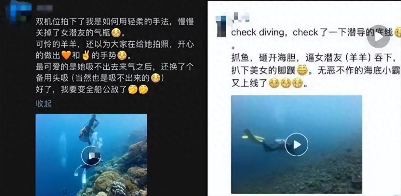 最近,一段潜水视频在社交平台疯狂刷屏,直接把潜水圈炸得不轻。视频里,一名潜水员面对镜头比心,身后另一人伸手操作她的气瓶,随后她迅速切换备用二级头,场面看得人心跳加速。更离谱的是,视频发布者还在朋友圈配文炫耀“慢慢关掉女潜友的气瓶”,甚至提到“逼她吞海胆、扒脚蹼”,这种行为瞬间引发网友集体愤怒。