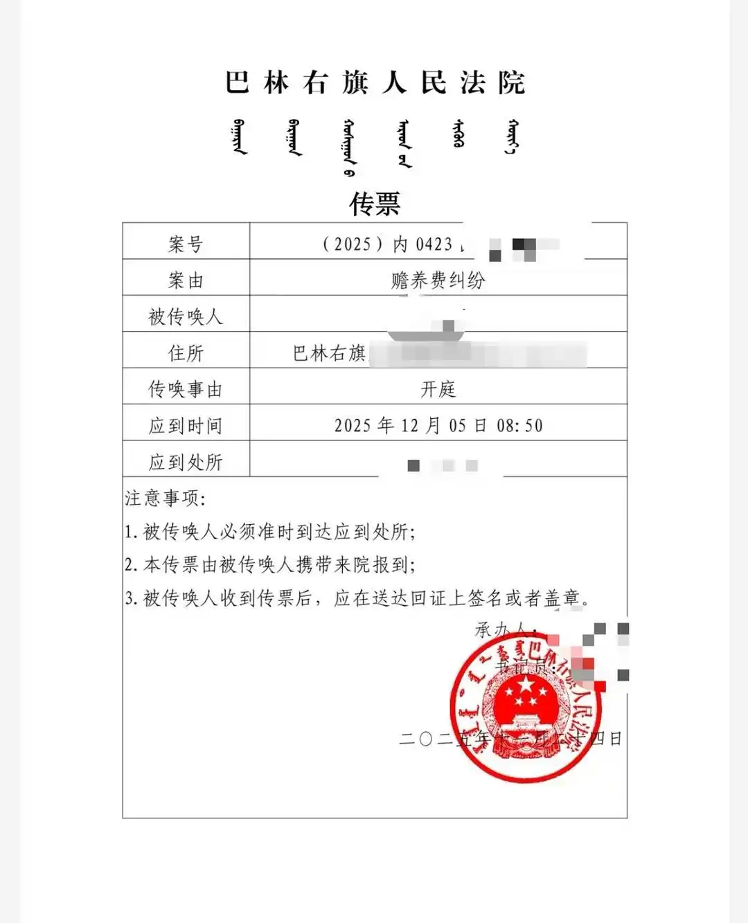 近日,内蒙古赤峰的王女士(化姓)向记者反映,她收到法院传票,父亲起诉她索要赡养费。传票显示,该案案由为赡养费纠纷,开庭时间定于12月5日。王女士表示,父亲在她三岁时与母亲离婚,之后几乎未参与她的生活,她认为自己离异、无工作,还要照顾不到一岁的孩子,无力承担赡养费,也不应该承担。