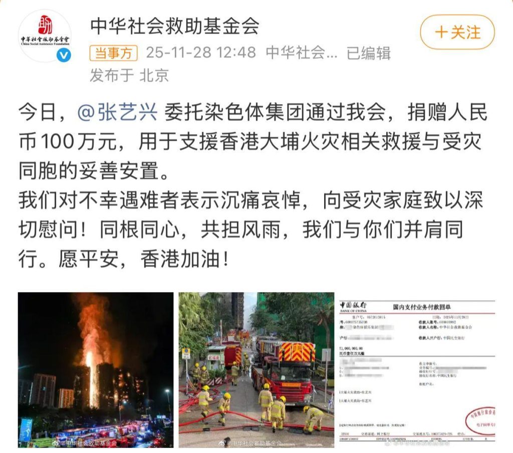 11月28日下午,中华社会救助基金会发布消息,确认收到演员杨紫捐款人民币100万元,用于援助香港大埔火灾受灾同胞的安置保障及灾后家园重建工作。同日中午,该基金会还公布了张艺兴捐款100万元的善举。