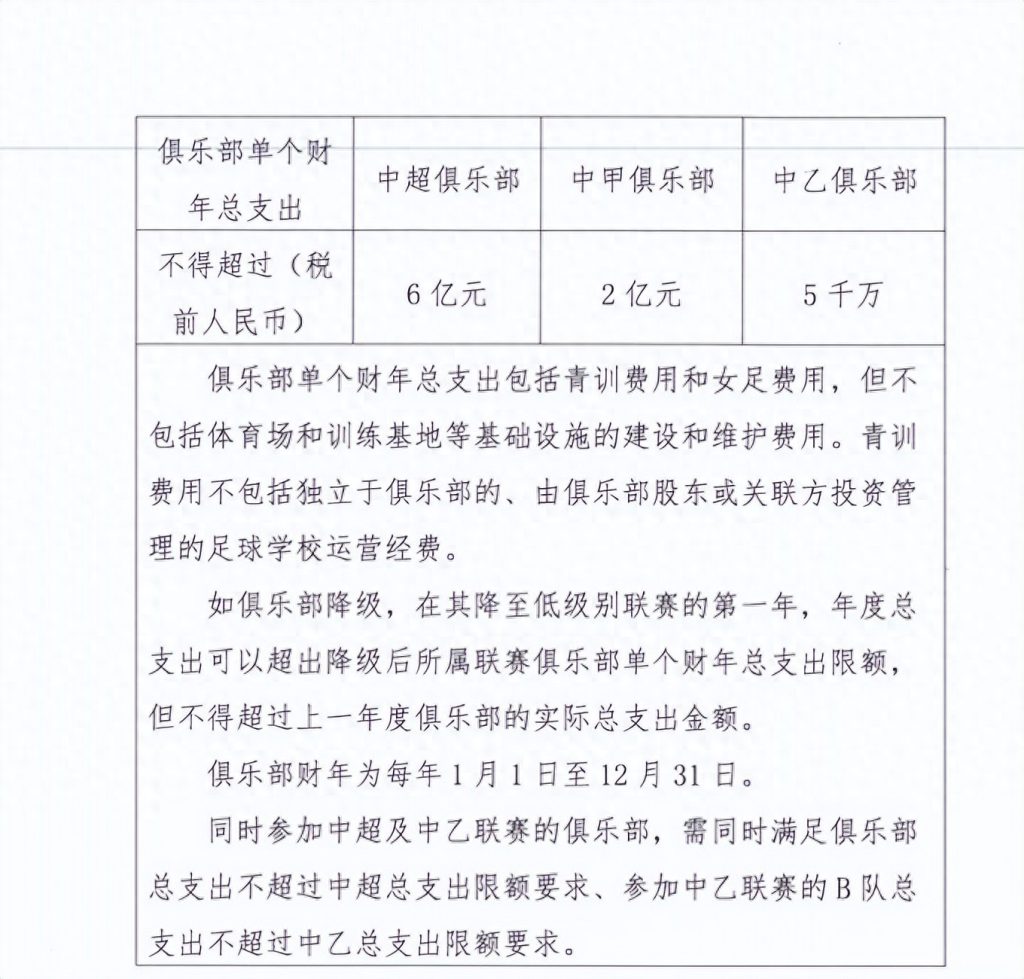 通知还特别说明,如果俱乐部降级,在降入低级别联赛的第一年,总支出可以超过该级别的限额,但不得高于上一年度的实际支出。同时,参加中超和中乙联赛的俱乐部,必须分别满足对应级别的支出上限要求,避免出现“母队豪花、子队失控”的情况。
