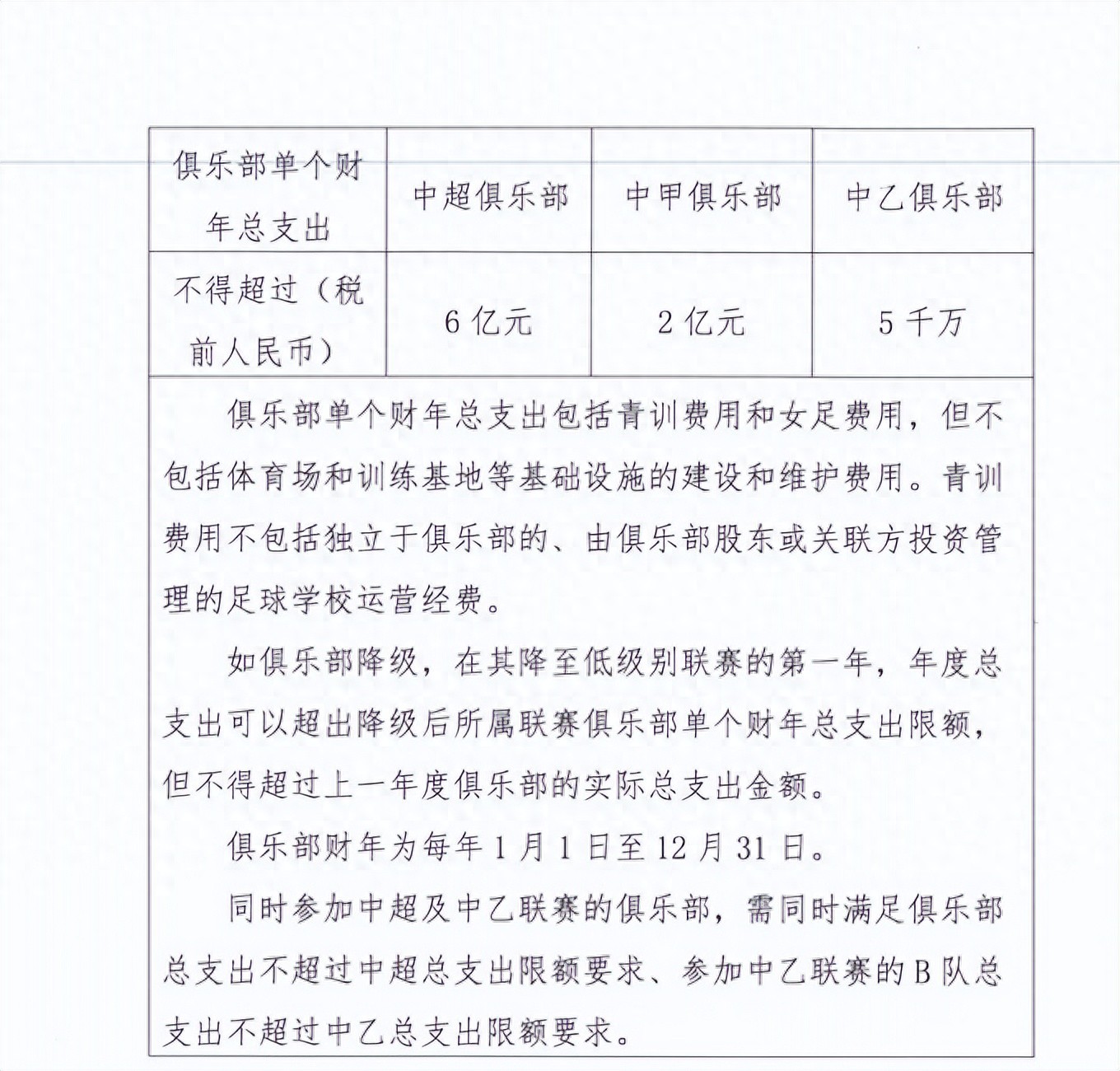 通知还特别说明,如果俱乐部降级,在降入低级别联赛的第一年,总支出可以超过该级别的限额,但不得高于上一年度的实际支出。同时,参加中超和中乙联赛的俱乐部,必须分别满足对应级别的支出上限要求,避免出现“母队豪花、子队失控”的情况。