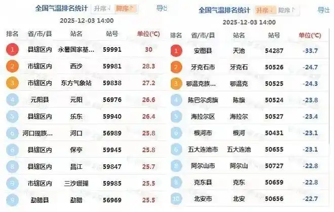 这波寒潮真的够猛,昨天早晨北方不少城市继续刷新今年下半年以来的最低气温纪录,哈尔滨、太原、北京、郑州等12个省会城市都创下新低。南方也没能幸免,贵州到长江中下游一带午后气温只有10℃左右,广西、福建等地降温幅度达到6到10℃。但广东、海南依旧“我行我素”,午后气温仍在20℃以上,海南三沙永暑站甚至飙到30℃,而吉林长白山天池却冷到-33.7℃,南北温差直接拉满,超过60℃,这画面真的魔幻。