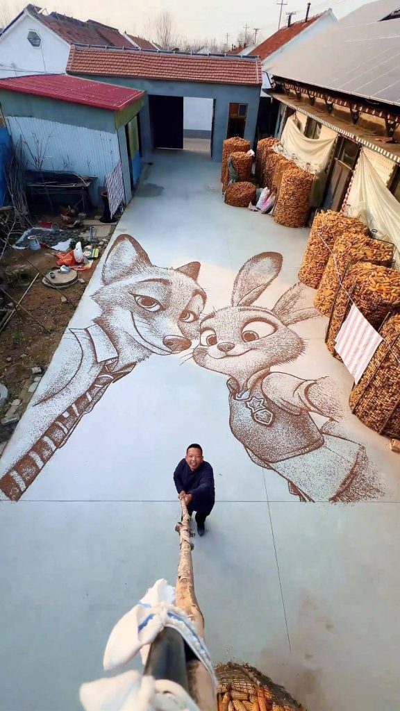 《疯狂动物城2》上映仅6天,票房就突破20亿元,电影火爆的同时,线下也出现了“疯狂”玩法。山东滨州的33岁农村小伙赵同恺,用自家田里收获的黑小麦,在院子里拼出一幅15平方米的巨型卡通画,画的是兔子警官朱迪和狐狸尼克。整个过程耗时约6小时,用了50斤黑小麦,上传社交平台后,21小时内收获200多万点赞、5000万阅读量,直接冲上热搜。