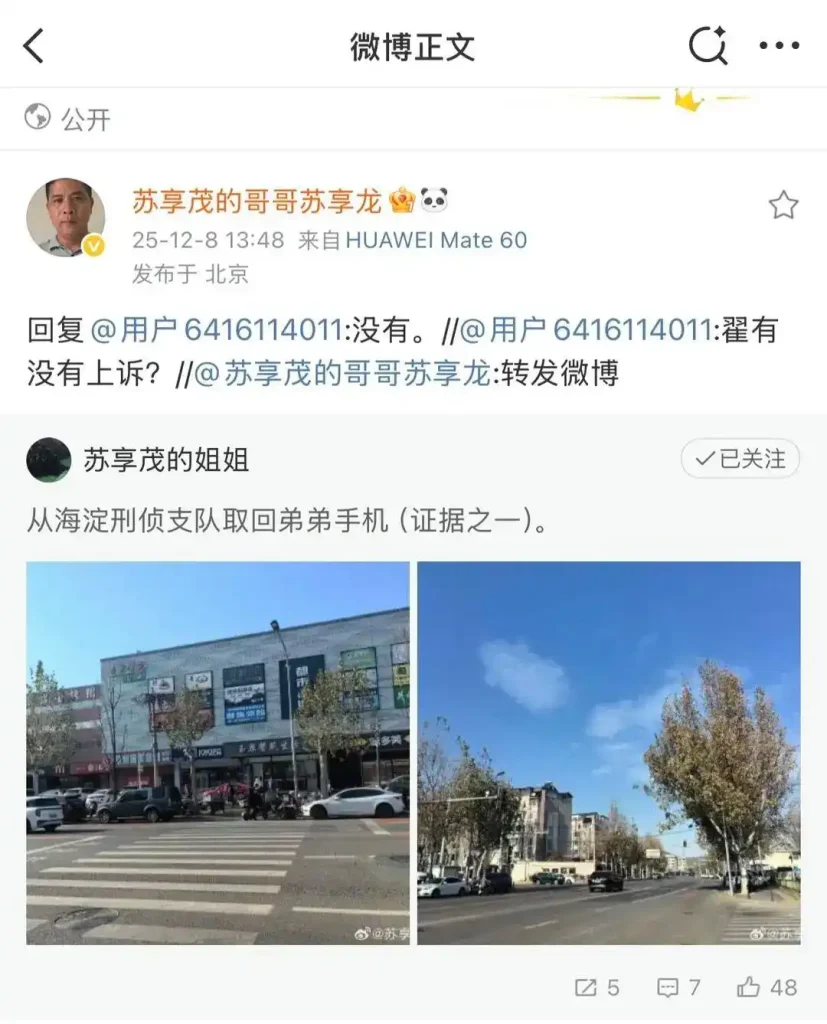 12月8日,苏享茂的哥哥苏享龙在微博上回应网友提问,确认翟欣欣并未提出上诉,并转发姐姐此前发布的消息,透露弟弟的手机已于12月5日从海淀警方取回。另一可靠渠道也证实了这一点,意味着这起备受关注的案件一审判决已基本定局。