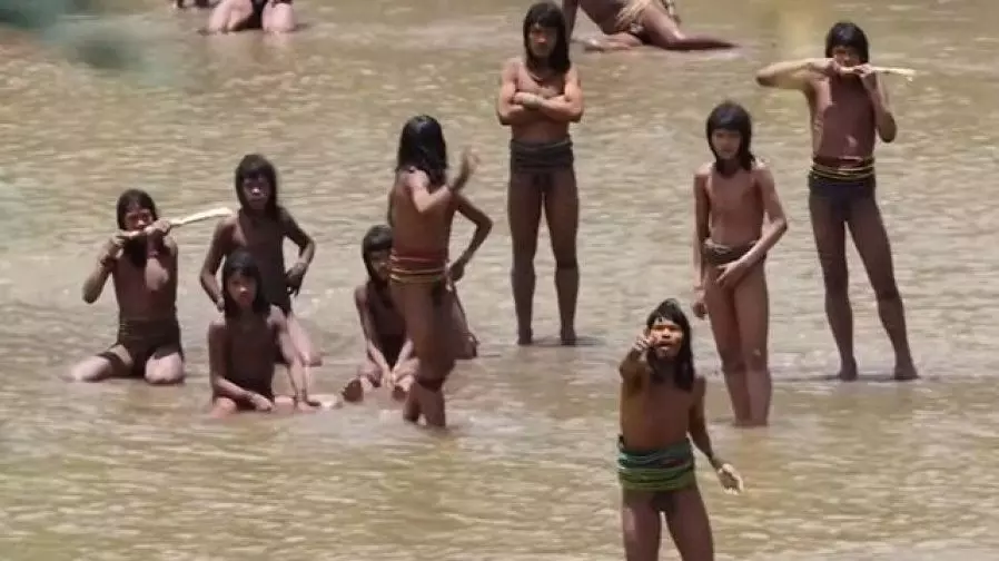 画面中可以看到,数名全副武装的部落成员从丛林深处现身,他们最初神情警戒,用手势示意探险队保持距离。然而,当探险队递上衣物和香蕉作为见面礼后,现场气氛突然变得轻松,成员们逐渐露出友善表情,甚至开始跳舞和吟唱,与来访者一度互动融洽。