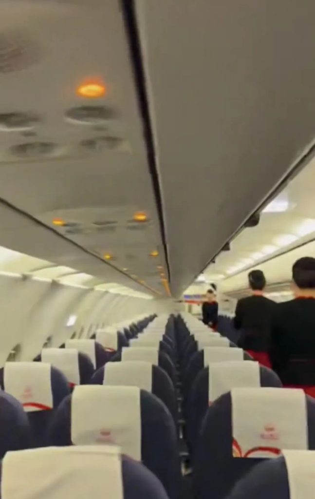 登机后,她发现偌大的客舱内,除了三名身着航空公司制服的空乘人员外,没有其他乘客。视频画面显示,客舱座位整齐排列却空无一人,三名空乘人员分布在客舱不同位置,按照正常流程完成安全提示和服务工作。