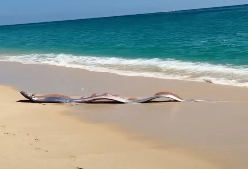 事情发生在墨西哥下加利福尼亚半岛南部的卡波圣卢卡斯海滩。上个月,一条体长约三十英尺(约九点一四米)的皇带鱼出现在岸边。这种鱼类通常栖息在水下三千二百英尺(约九百七十五米)的深海区域,极少被人类在近岸目击。