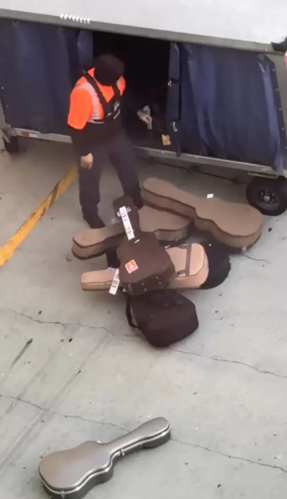 尼克表示,这一场景让他感到非常不安。他说,当下的第一反应就是拿出手机记录下来,希望能留下证据,也希望这些吉他的主人最终不会遭受严重损失。从视频中可以清楚看到,行李操作人员几乎是将琴盒当作普通货物,用力扔到一堆行李中,动作显得十分随意。