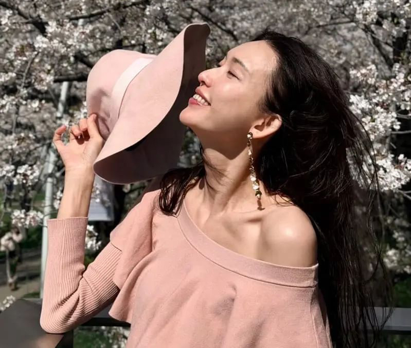 照片中,林志玲站在盛放的樱花树下,粉白色花朵铺满背景,整体画面充满春天气息。她身穿柔粉色斜肩针织上衣,肩颈线条自然流畅,锁骨线条清晰却不过分张扬,展现温婉而自信的女性气质。搭配垂坠式耳饰,随着动作轻轻晃动,为整体造型增添细腻的浪漫感。