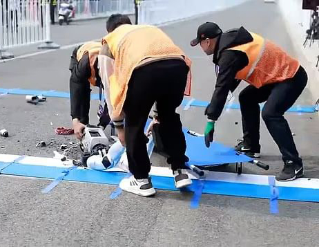 更具反差感的是,随后有 5 名工作人员迅速冲入画面,抬着担架将机器人残骸“送离”现场,仿佛在救治一名受伤选手。这一幕也让不少网友调侃称,这是人形机器人半马中的名场面。