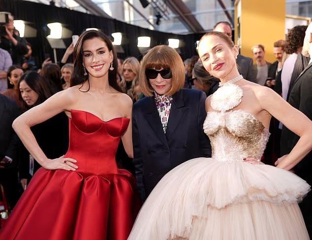 现年43岁的安妮·海瑟薇在活动中选择了一件路易威登打造的深红色抹胸礼服,整体设计采用紧致上身与外扩褶裥裙摆相结合的造型,线条利落而不失优雅。她将深色长发自然垂落,搭配同色系厚底凉鞋,并佩戴宝格丽珠宝,为整体造型增添精致感。海瑟薇在原作中饰演初入时尚行业的助理安迪·萨克斯,此次回归让不少影迷倍感期待。