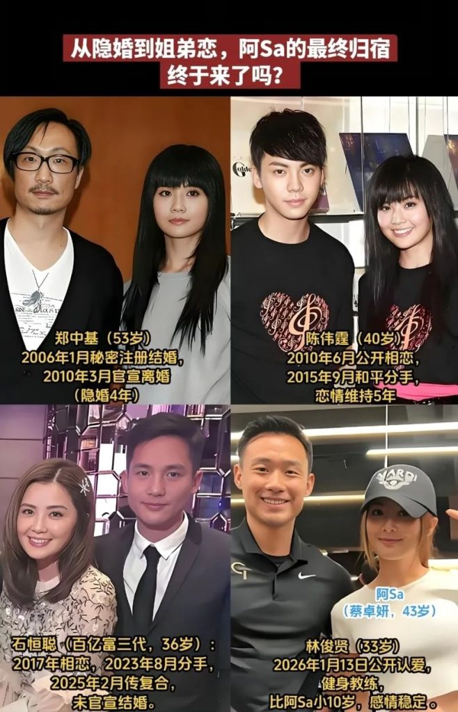 年43岁的香港艺人蔡卓妍(阿Sa),于4月28日中午突然公开婚讯,在微博等多个社交平台晒出婚纱照,正式宣布与小她10岁的健身教练林俊贤(英文名:埃尔维斯)结为夫妻。消息一出,迅速引发热议。随着这段感情修成正果,她过往多段备受关注的情感经历,也再次被外界提起。
